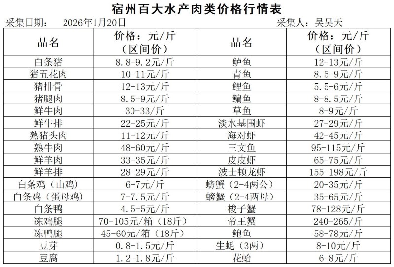宿州百大2026-01-20价格行情