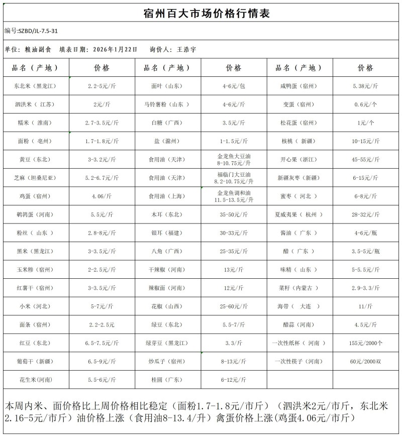 宿州百大2026-01-22价格行情