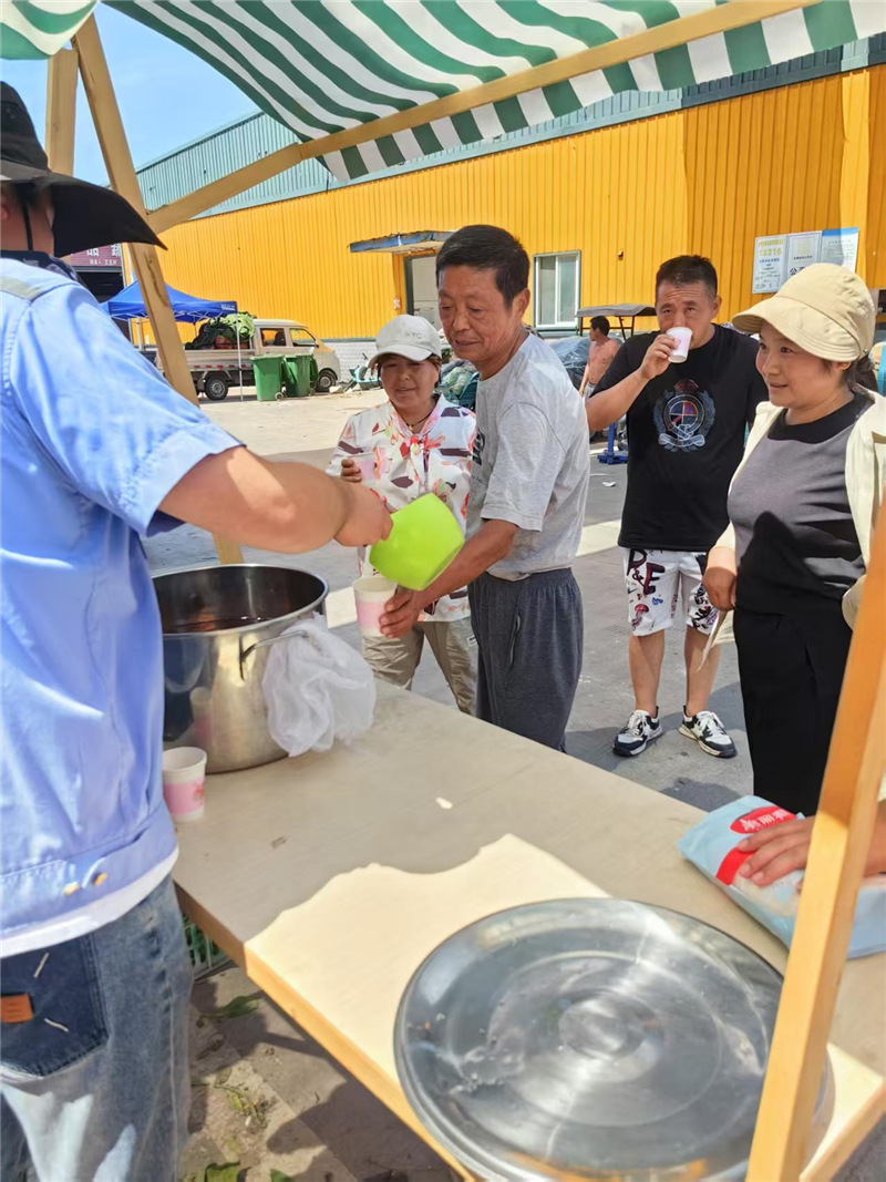 “师傅,歇会儿,喝碗绿豆汤吧!”在地产菜销售专区,菜农接过绿豆汤时,脸上满是惊喜。一位菜农大爷笑着擦汗:“这汤喝下去,浑身都舒服了,比空调还解暑!”一位调货客户接过矿泉水和草帽时,忍不住感叹:“草帽正好遮住太阳,这下采购不遭罪了。”这样的场景每天都在市场上演,看似简单的服务,却架起了人与人之间最真挚的桥梁。