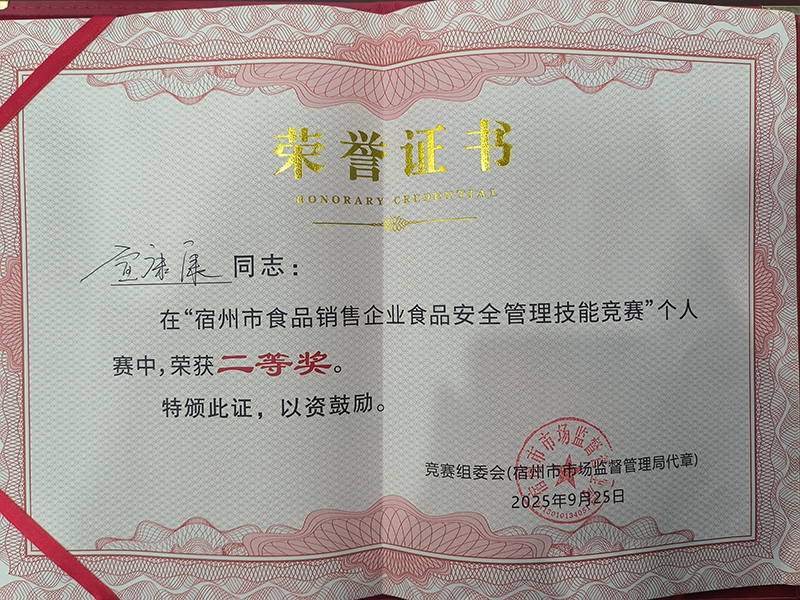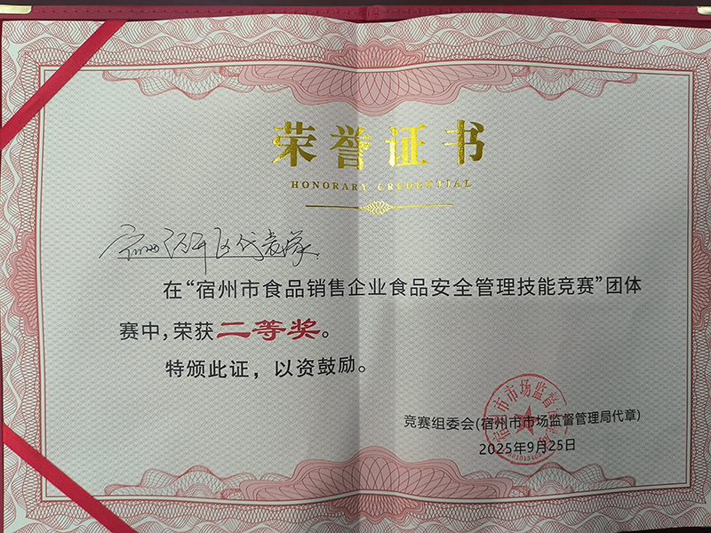 9月25日,宿州市举办食品销售企业食品安全管理技能竞赛,宿州百大代表经开区参赛并荣获团体赛二等奖和个人赛二等奖两项殊荣。